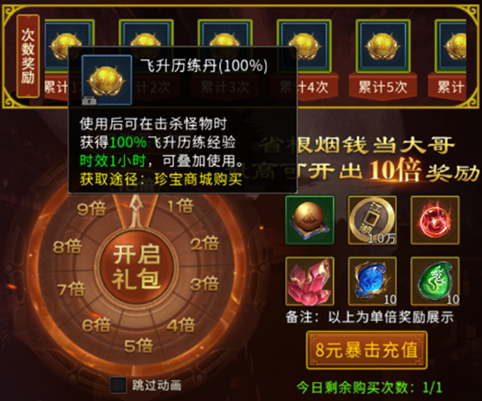 其中,暴击礼包是在飞升系统活动中最具性价比的一个礼包。通过充值8元之后,我们就能开启转盘抽取倍数来开启奖励翻倍获得道具,主要的道具奖励有:飞升历练丹、江湖币、金身经验丹、飞升洗练石、首饰精魄以及防具精魄这六种奖励道具。每次购买一次礼包后还能领取到次数奖励(100%飞升历练丹)。