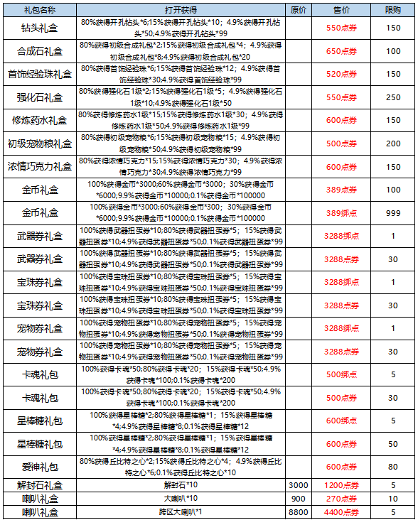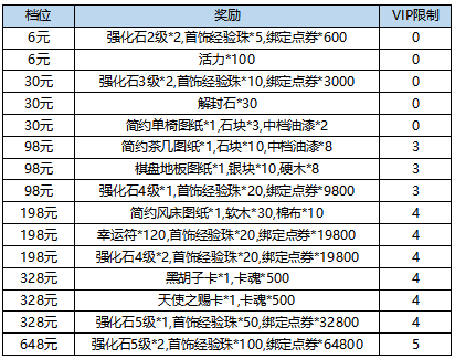 活动规则:6元、30元强化石礼包、活力礼包每日重置刷新,其余礼包每周限购1次。