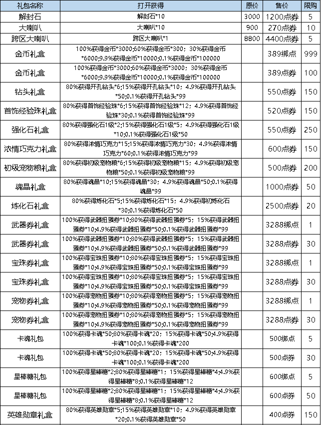 活动时间:12月12日00:00:00 - 12月18日23:59:59活动规则:6元点券礼包、30元活动自选礼盒每日重置刷新,其余礼包每周限购1次。