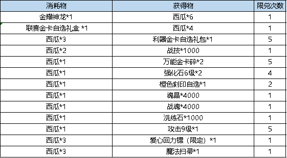 活动规则:消耗指定道具可兑换指定道具,注意限购次数及兑换物。