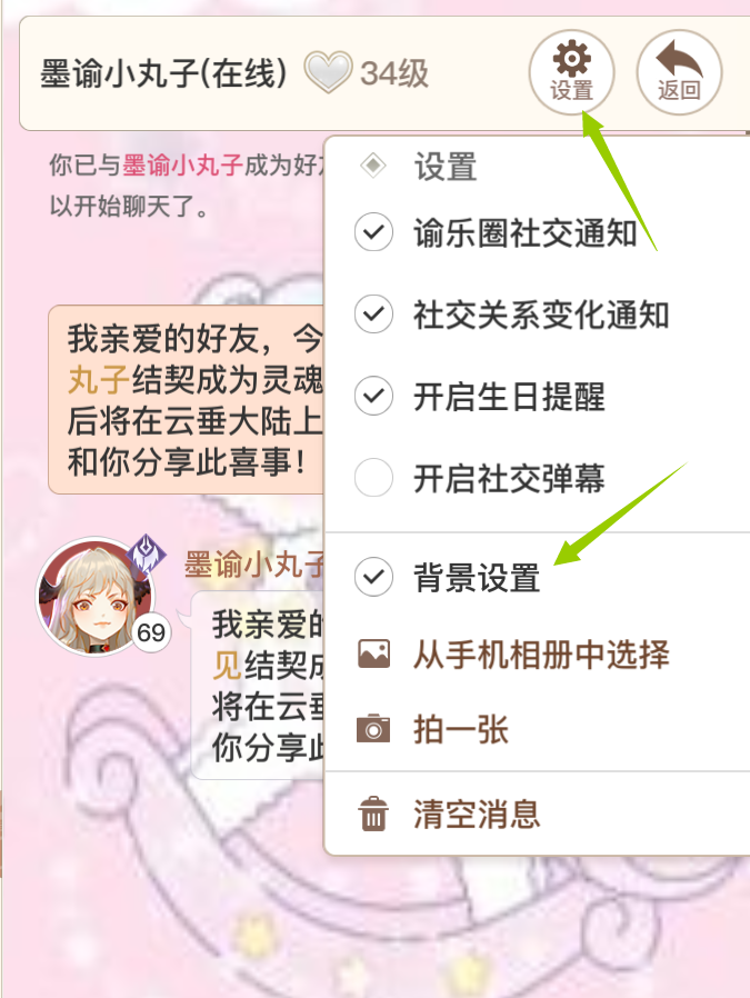 7. 个性化私聊界面:可以自定义你和结契私聊界面的背景图片。 (上传的图片需要审核片刻)
