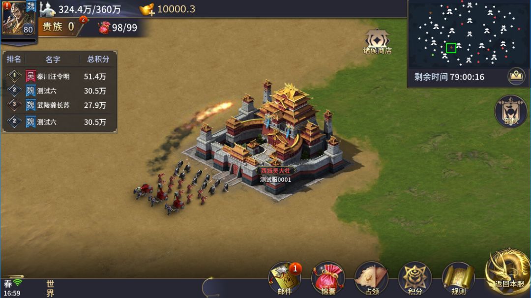 由于在游戏前期没有去占城池,所以你的基础积分为0,不太会引起其他强势玩家的注意,你可以毫无顾忌的加入与他人的对战中(反正被人破城也没有任何损失)。这样即使掠夺颗粒无收,最后依然可以轻松收获6万分。