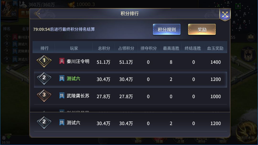 如果有人配合的话,还可以考虑与另一位已经连破5次的主公互相破对方的城,这样就可以拿到最高档次的终结积分(约2万分,最后结算)。