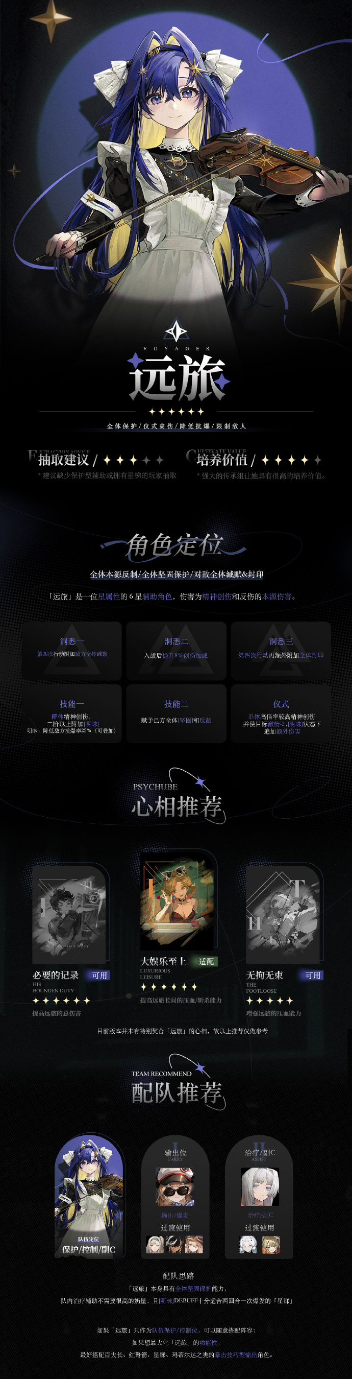 角色一图流内容包括:角色评级、配队思路及推荐、心相推荐、认真看完一图流,各位司辰们就可以对远旅的玩法有一个大致的思路。