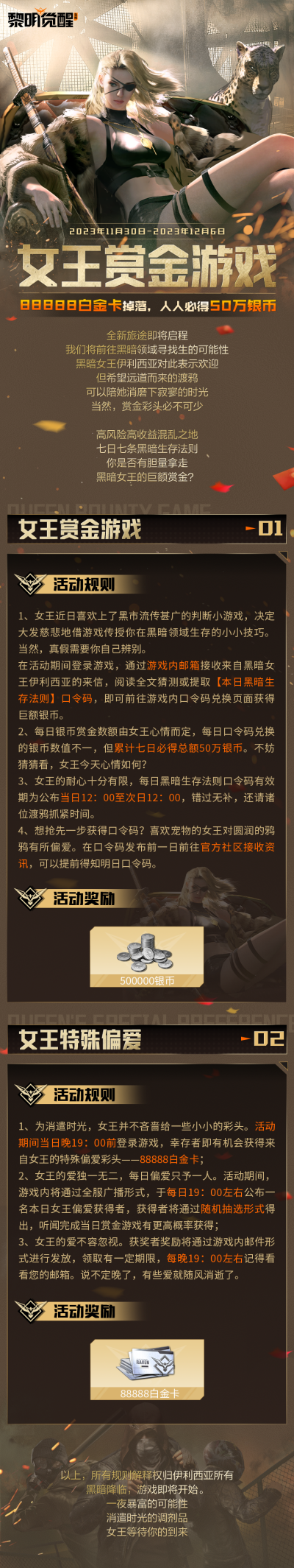 被女王偏爱的鸦鸦已经率先拿到了明天的口令码,11月30日12:00至12月1日12:00期间,复制口令码“女王至上”前往游戏内侧边栏「公告」-「资讯」-「口令兑换」页面输入即可获得由女王心情而定的大量银币,过期无补,七日登录可领总额50万银币!记得明天再来找鸦鸦领取后续口令码哟~