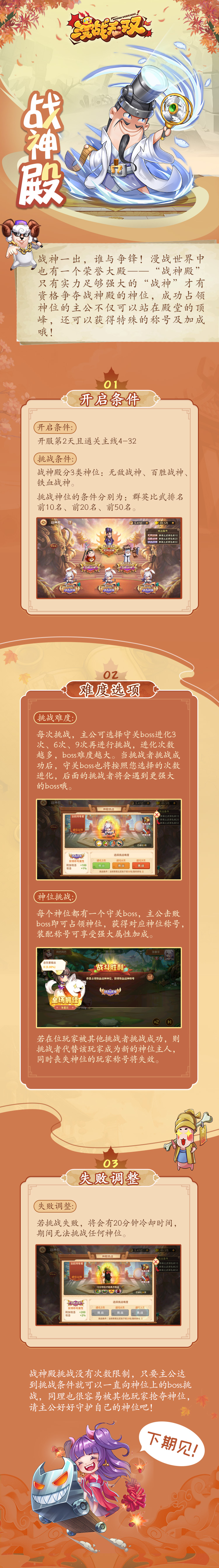 战神一出,谁与争锋!漫战世界中也有一个荣誉大殿——“战神殿”只有实力足够强大的“战神”才有资格争夺战神殿的神位,成功占领神位的主公不仅可以站在殿堂的顶峰,还可以获得特殊的称号及加成哦!