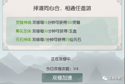 04加速卡使用优化1、炼丹、炼器、禁地探索、云游、双修等界面新增“加速”按钮,可通过此按钮快捷使用背包内的各种加速卡。