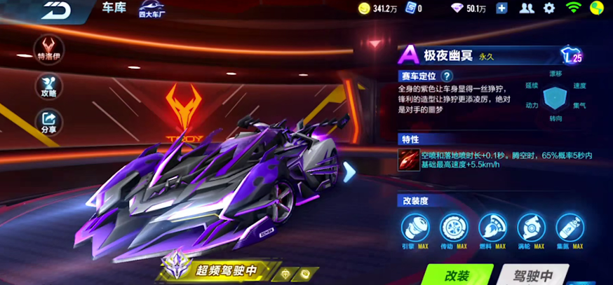 首先,我们先来看一下这辆赛车的外观,这辆赛车的外观,非常的炫酷,如果说是一辆钻石A车,都不过分,炫紫色的外表,再搭配上黑色的点缀,让这辆赛车完全符合它的名字。而至于符合道具的赛车改装,建议大家选择左左左,核心的思想就是为了增加小喷动力。