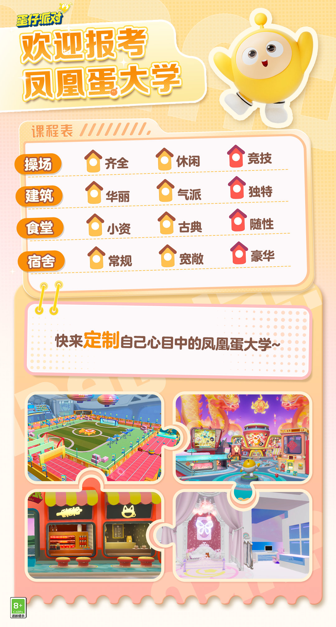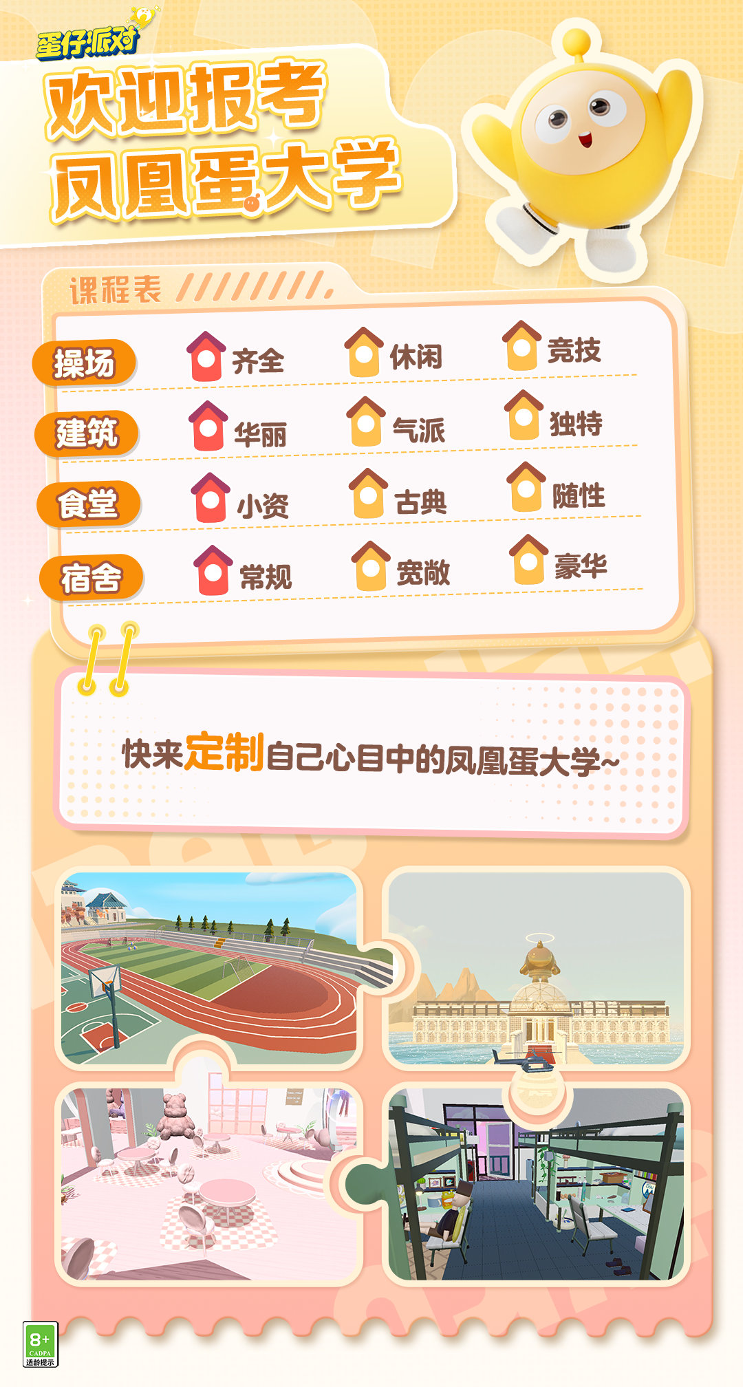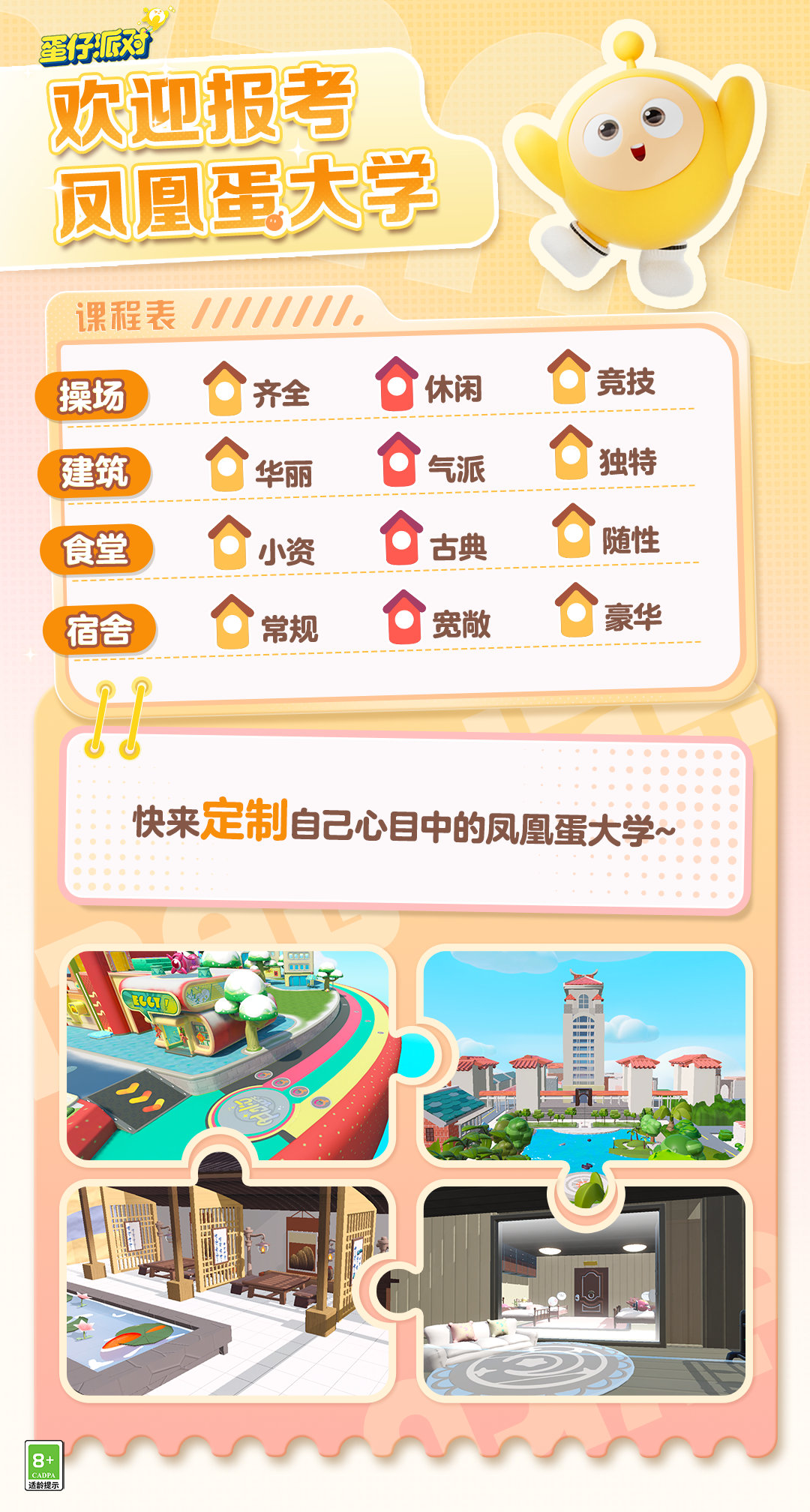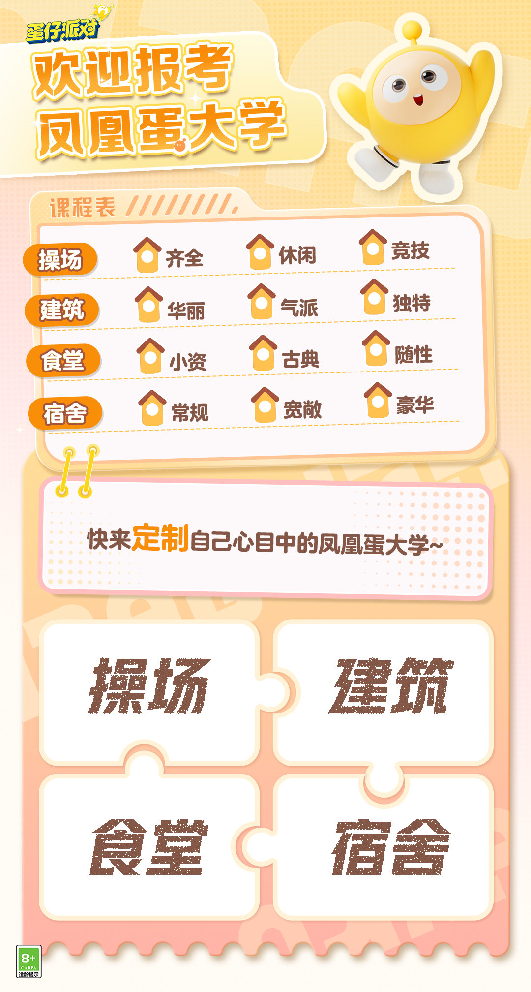 只有蛋仔想不到,没有凤凰蛋大学给不到!设施齐全的操场,富丽堂皇的建筑,古色古香的食堂……多“款”校园场地尽情挑选,蛋仔们快和皮蛋一起定制自己心目中的那“款”凤凰蛋大学吧~