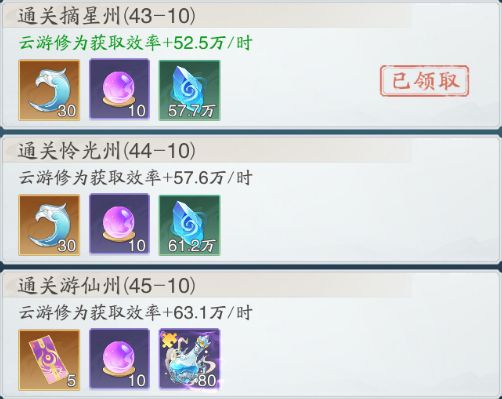 云游挂机奖励1.云游挂机奖励和云游关卡进度正相关,在每天长时间挂机前尽量消耗所有资源提升境界,以便在最新历练进度的状态下进行挂机