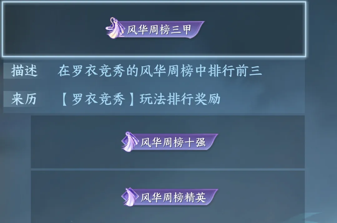 每场【罗衣竞秀】活动结束后,取每位同门的当场的星光热力(即心动热力和应援热力的总和)进行风华周榜排名结算,根据排名可获得限时头衔、限时配饰:紫霓贯夜等奖励。