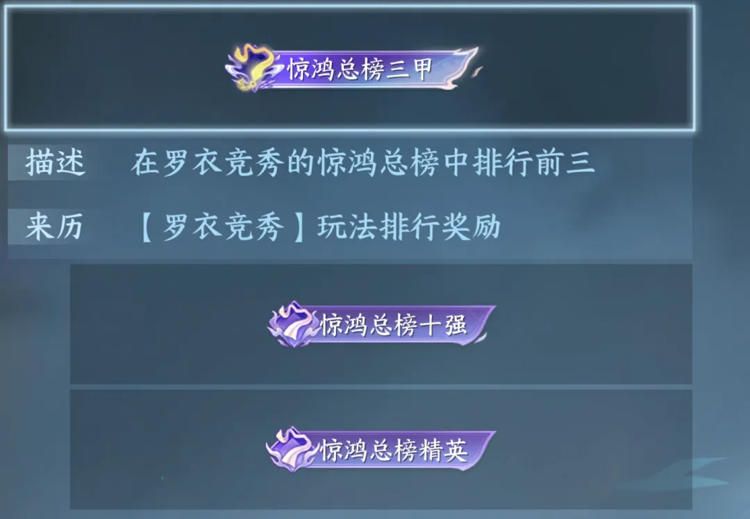 四场【罗衣竞秀】活动结束后,会取每位同门的最高星光热力进行惊鸿总榜排名,根据排名可获得限时头衔、限时头像框等奖励。同时,每个服务器前三名的同门会进入惊鸿榜,可向整个江湖展示您的穿搭!