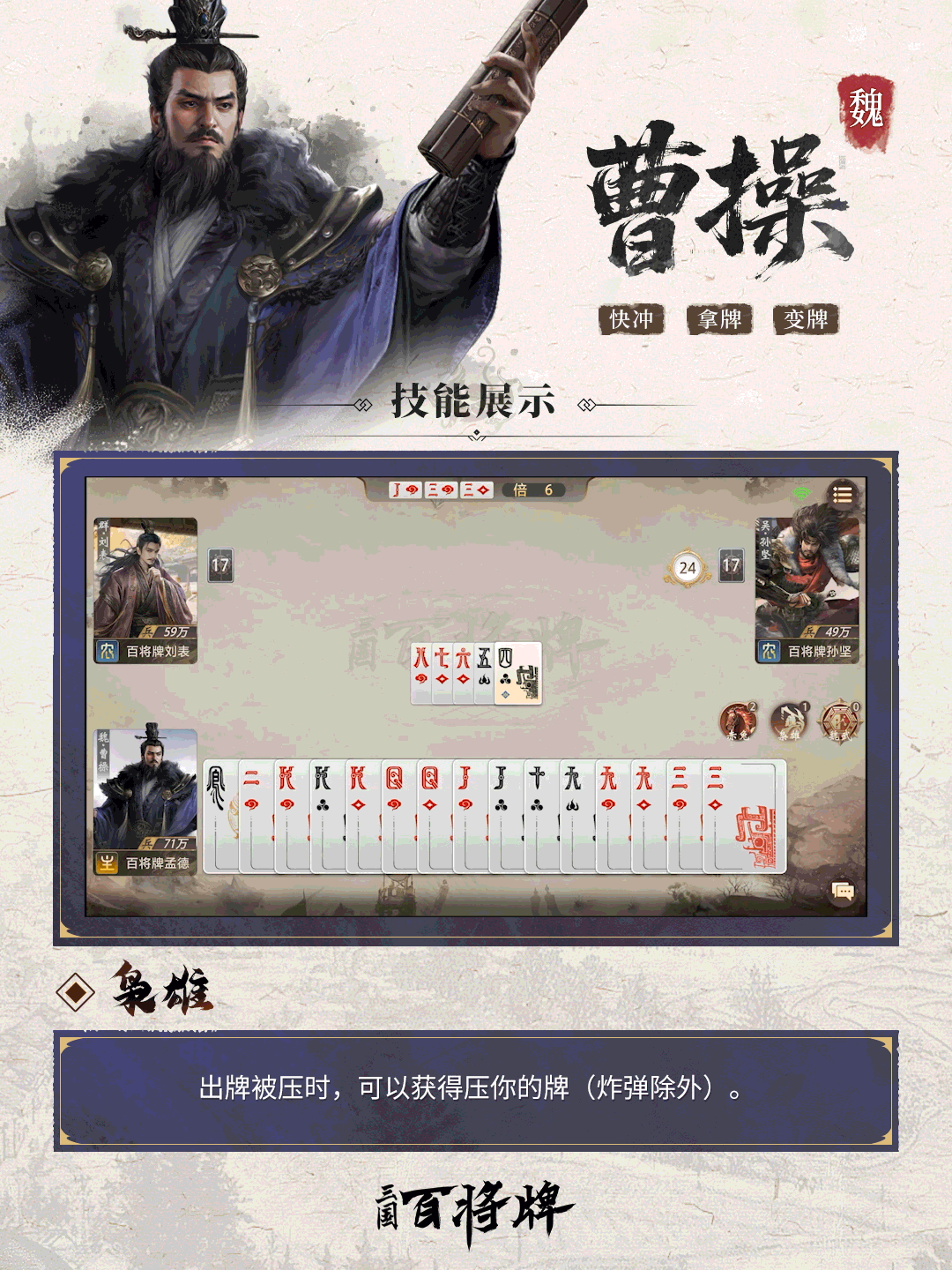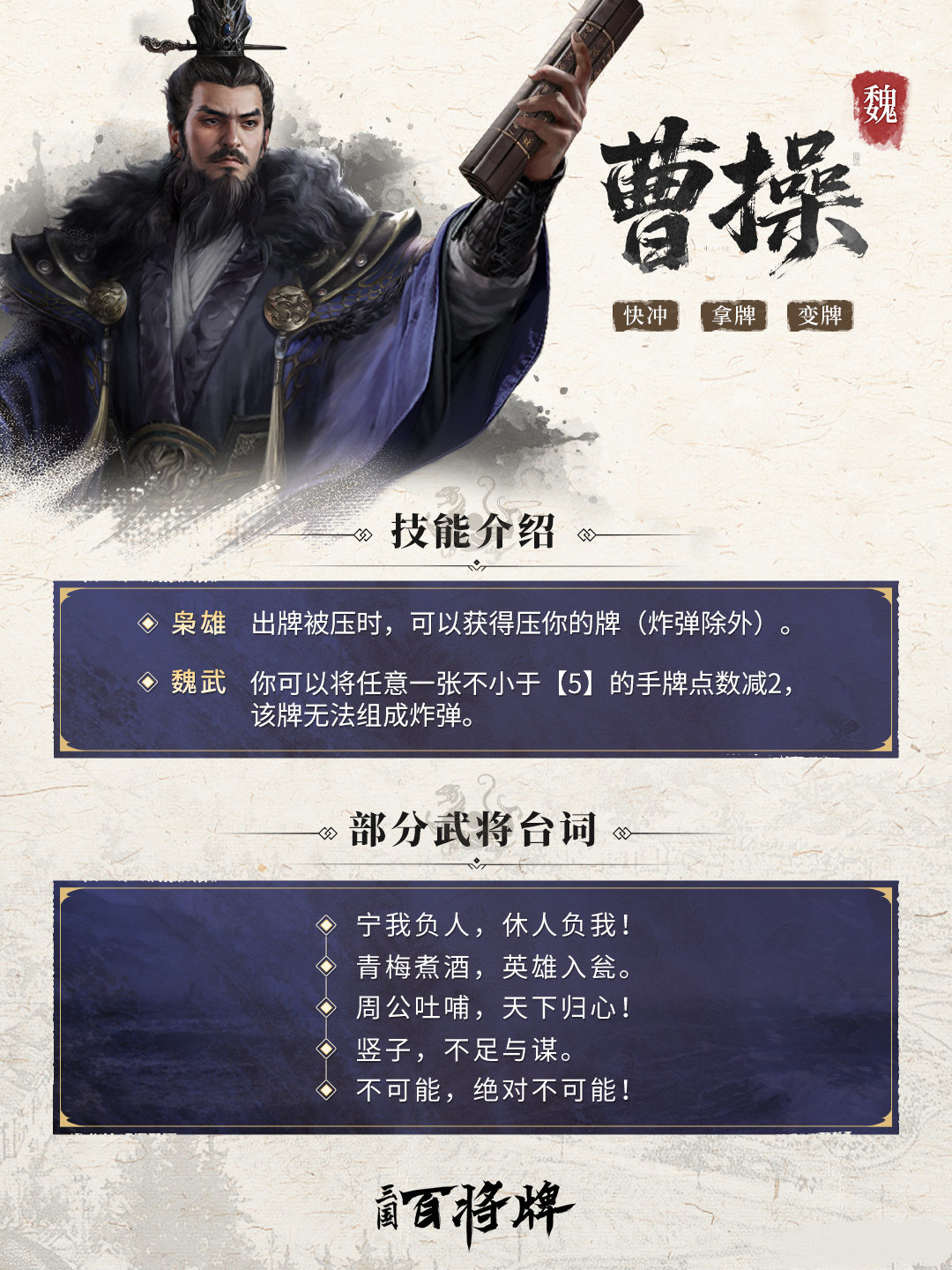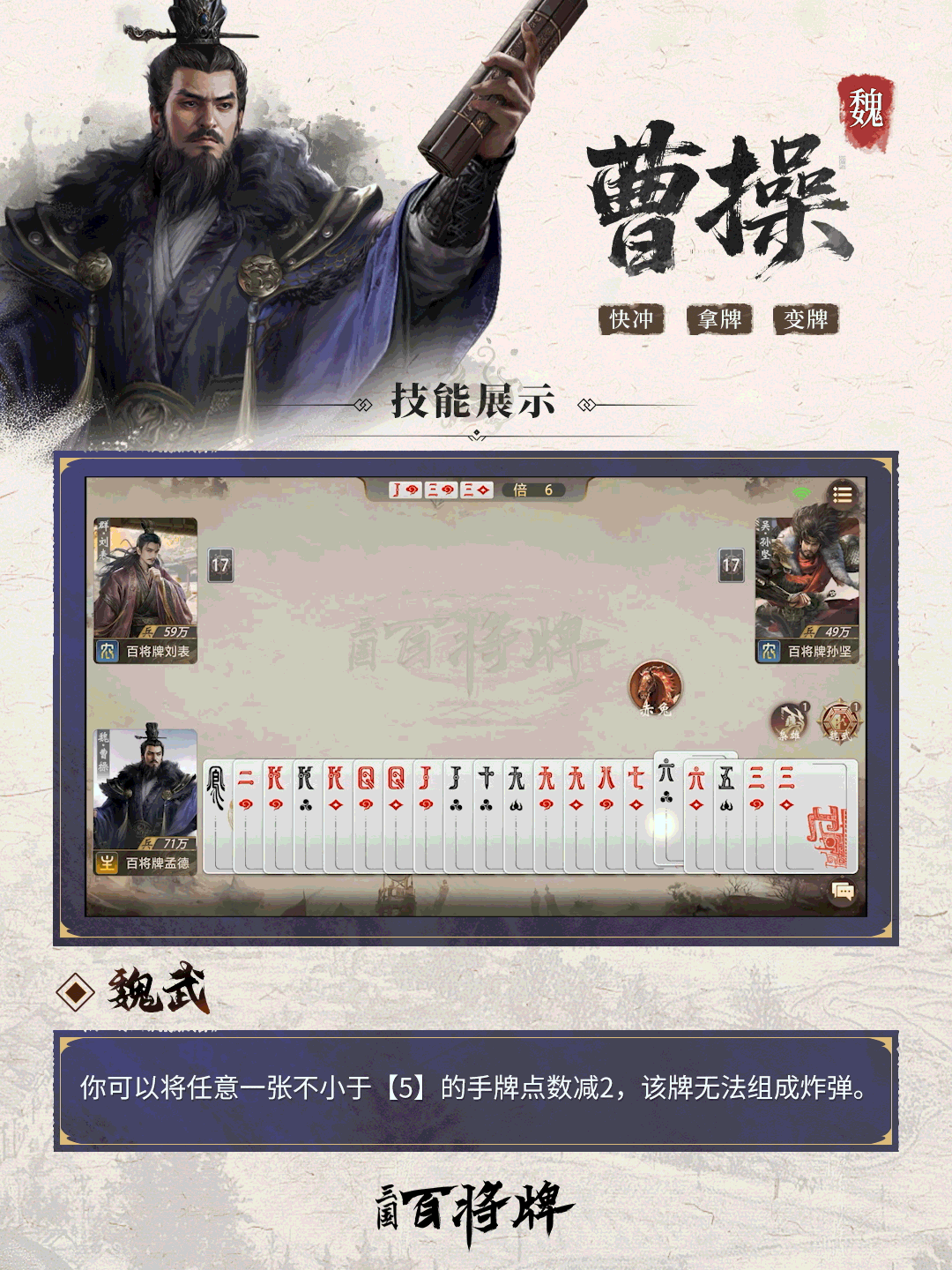 ◆技能简介:在《三国:百将牌》中,曹操出牌方式灵活多变,可运用技能使一张手牌点数-2;也可诱使敌方压制,从而帮助自己补充手牌,这般虚虚实实、步步为营的打法,尽显他在三国乱世中,挟天子以令诸侯的枭雄本色!