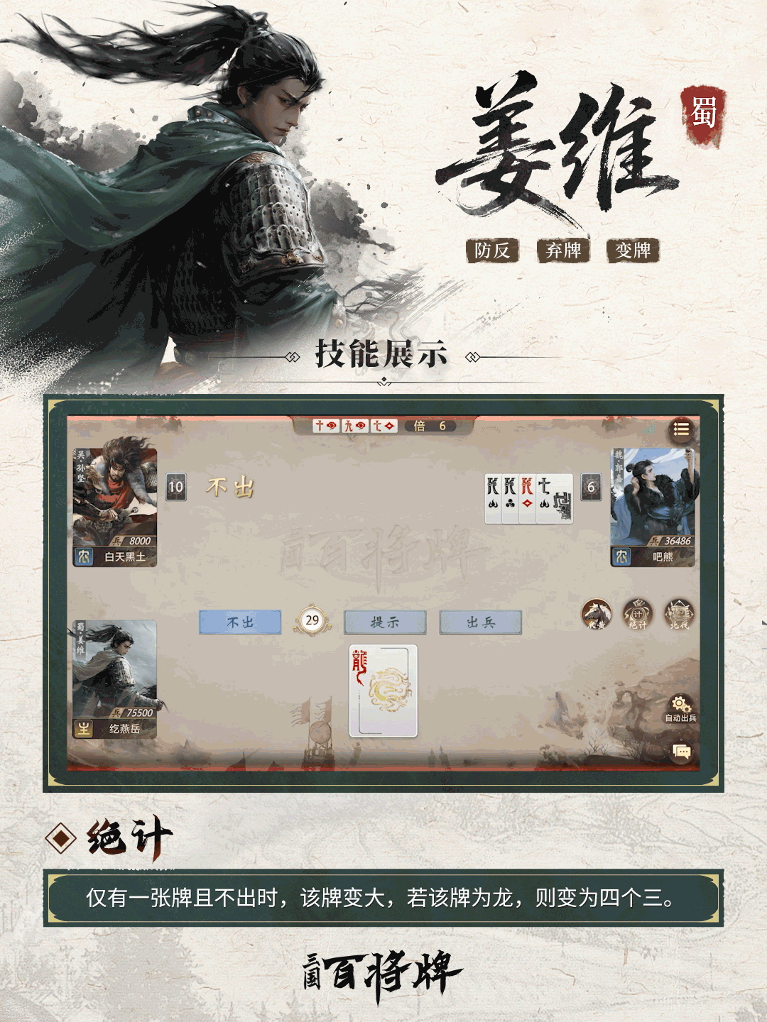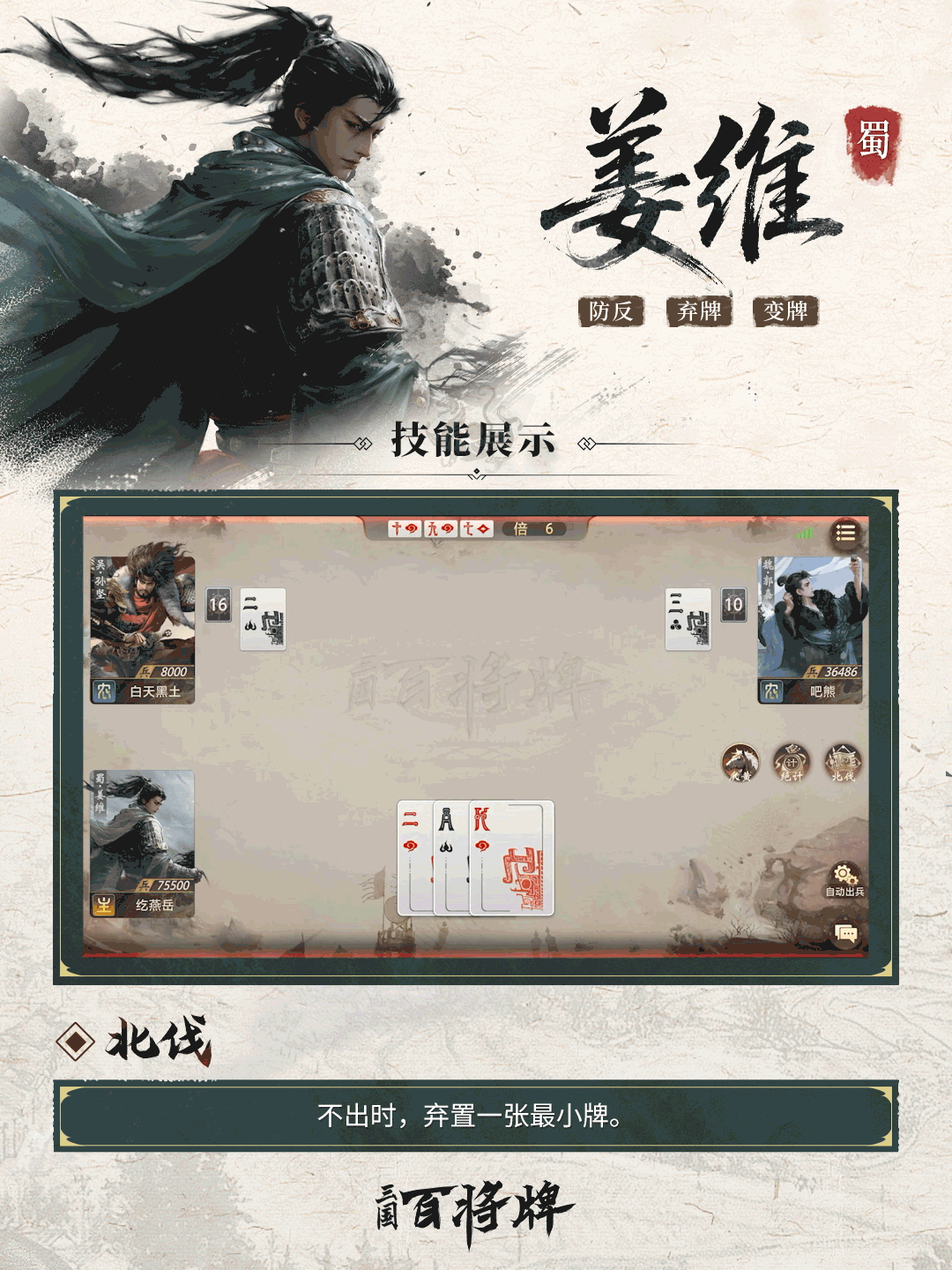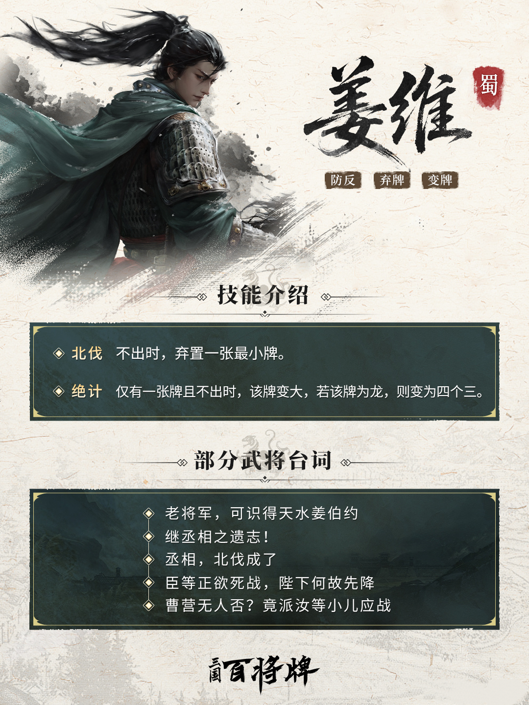 ◆技能简介:在《三国:百将牌》中,姜维擅长以退为进,并在决战时刻撕开破局之机。