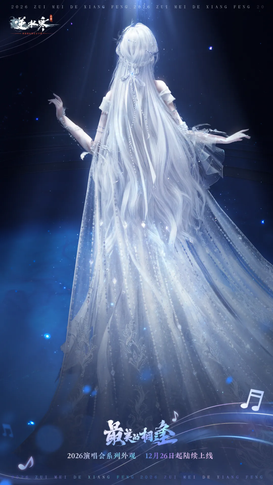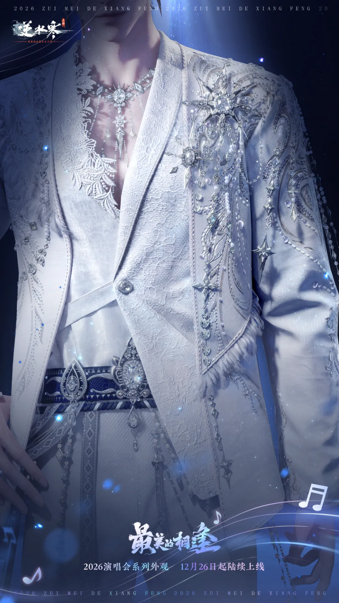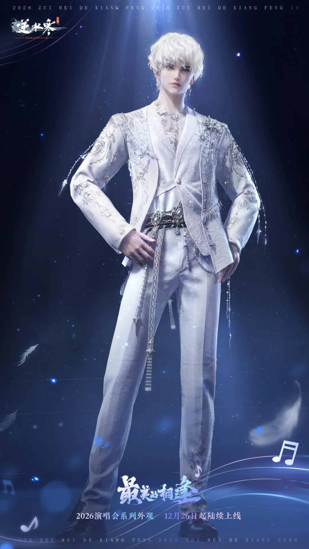 12月27日(星期六)至2026年2月6日零点,逆水寒演唱会主题时装【皓律星芒/梦羽凝弦】将限时上架商城,直售价【2880纹玉】,可使用限定纹玉、代金券、半价券。获取时装后,各位同门还将同步解锁黑发头像、单人动作、双人动作以及群龙之首动画。