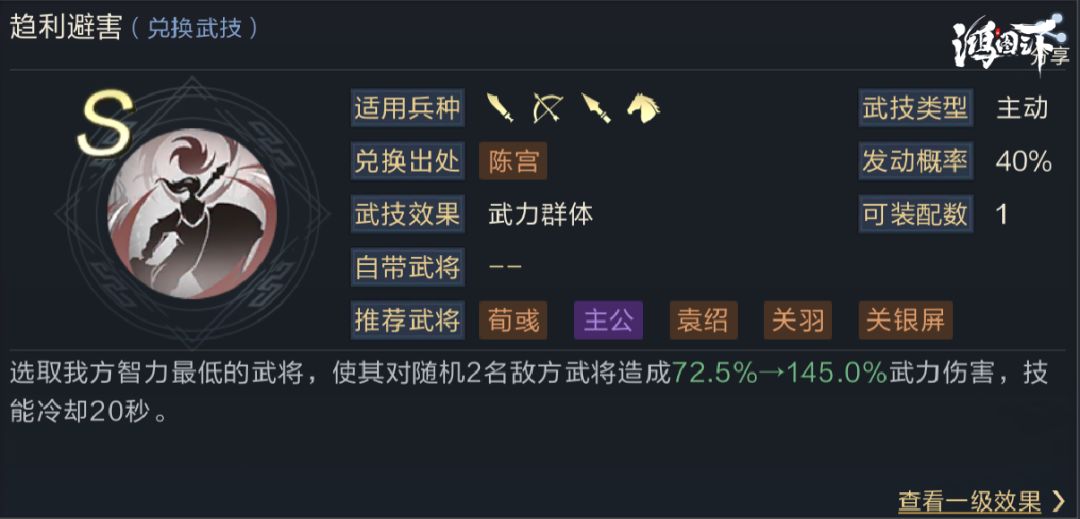 2号武技推荐趋利避害,该技能可稳定选取张飞对敌方进行攻击,并且该次攻击会计算张飞自身所携带的状态和加成,是最常用的工具人输出技能。