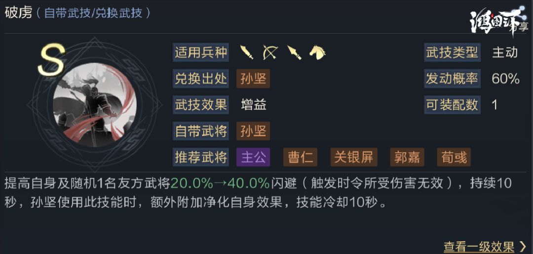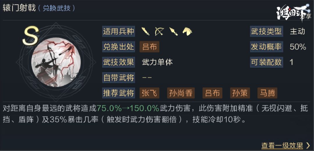 2号技能推荐辕门射戟,该技能作为老牌单体爆发技能,在S1中有非常亮眼的表现,之后版本较为流行减伤和增防的堆积,这使得辕门的处境略显尴尬。但在辕门发动率调高后,这个技能在张飞手中发挥依然出色,配合其主将技可将暴击率提升至65%,并且无视抵挡、盾阵、闪避,克制目前大多数主流队伍。