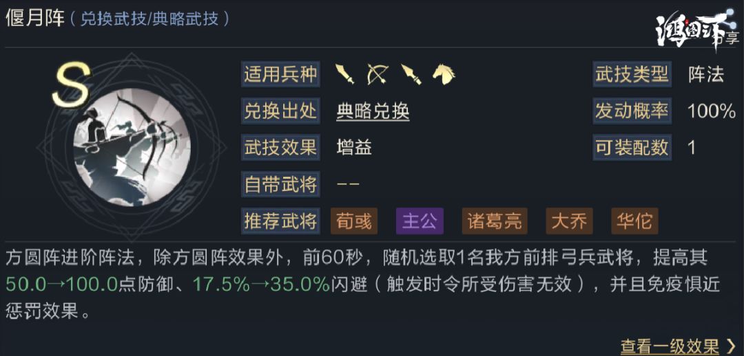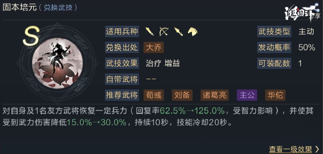1号武技推荐固本培元,这套队伍的缺陷在于续航和武将实际坦度较低,全靠触发抵挡来降低伤害,即使在偃月阵的加成下诸葛亮也很难承受频繁的武力攻击,固本培元的治疗与武力减伤效果可弥补这一劣势。