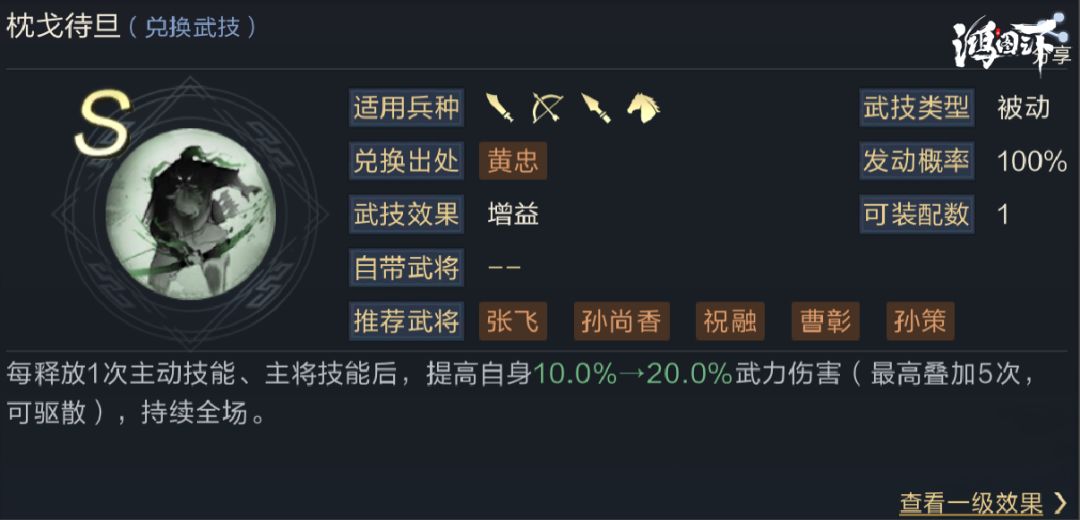 1号武技推荐枕戈待旦,该技能可让张飞每次释放技能后都获得20%的武力伤害加成,满层后100%的伤害提升配合暴击,能让辕门打出“追梦一击”。当前版本很少遇到带驱散或张燕的队伍,该技能的效果足够稳定。