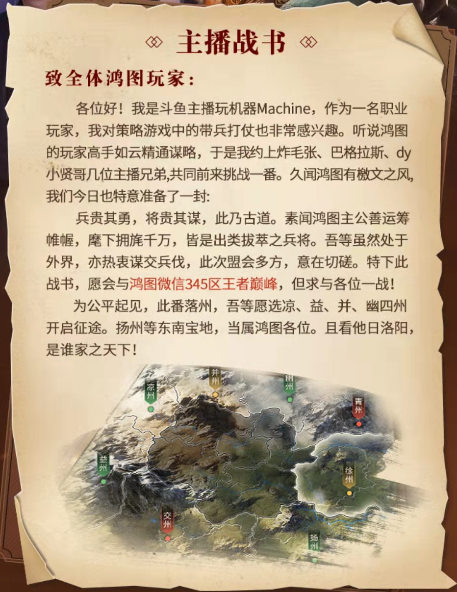 哦对了!想必主公们对这几位主播所下战书内容非常好奇,小图先行阅读了一番,不得不说高手就是高手,短短几日便学到了鸿图中的精华部分,虽然战书来势汹汹,但小图相信以主公们的能力绝不会弱于他们!