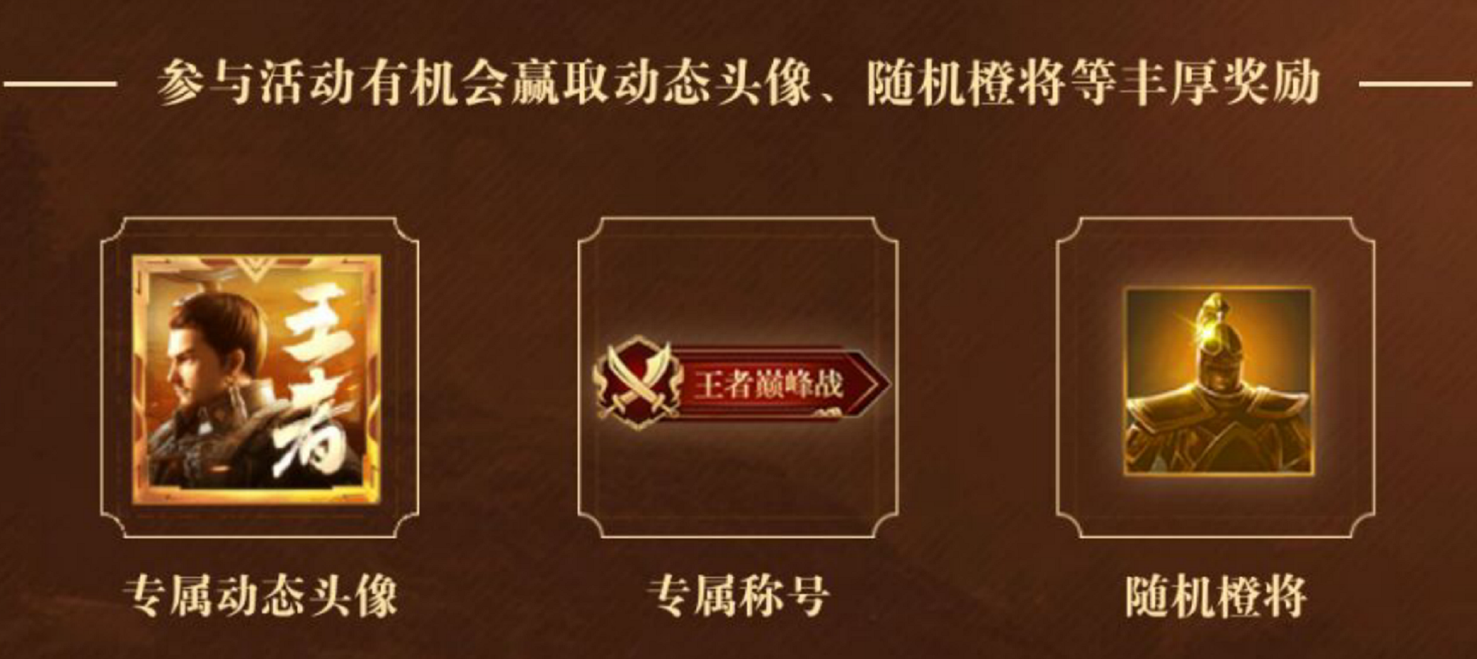 报名并在王者巅峰创建角色的玩家,可以领取专属【出战奖励】和【成长奖励】到王者巅峰服角色中,包含虎符、随机橙将等奖励内容。
