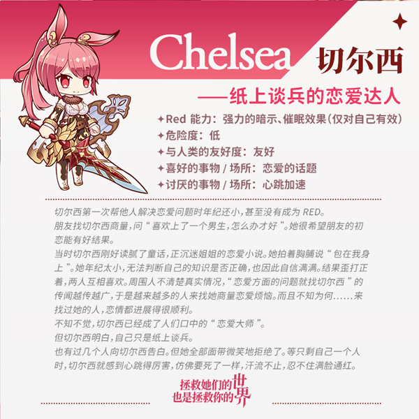 「没有哪个女生不知道恋爱大师切尔西!她懂得恋爱的甘酸,理解我们的一切心情!你遇到恋爱上的问题,也去找切尔西商量吧。她转眼间就会为你解决的!」