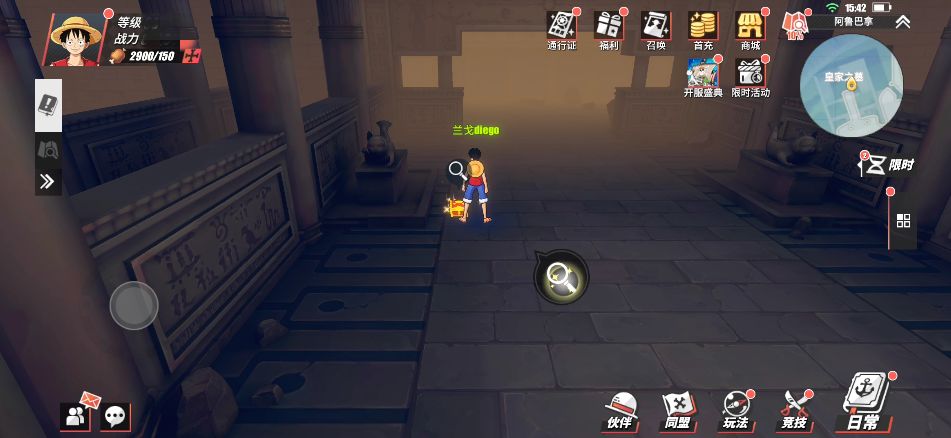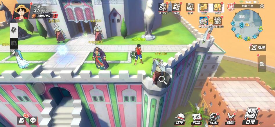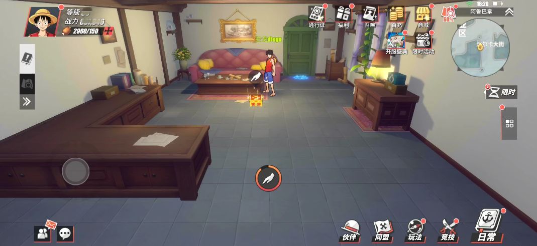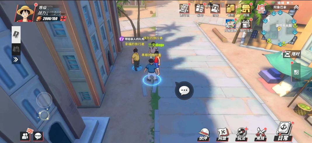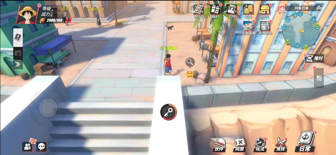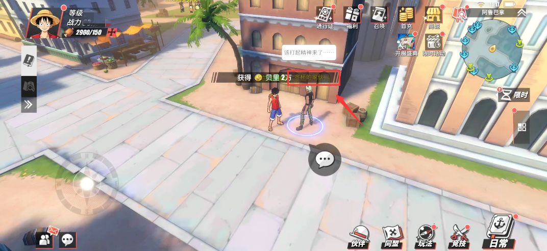 在阿鲁巴拿城的东南入口处,这里的小道边会有个NPC“贪杯的家伙”,玩家与他对话,并在对话结束后可以获得2万贝里。