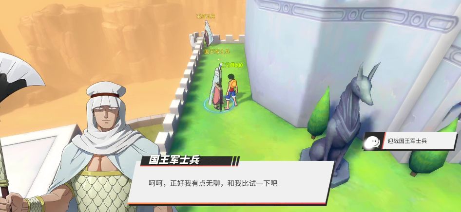 我们再来到王宫的左侧,在这里也有一个NPC“国王军士兵”,而他的后方就是藏密码的位置。玩家需要先跟它PK,赢了之后才能过去并获得密码。这里的密码是0202,大家可以尝试一下。