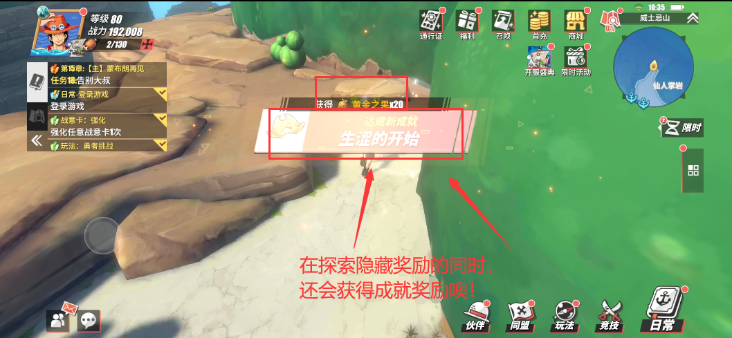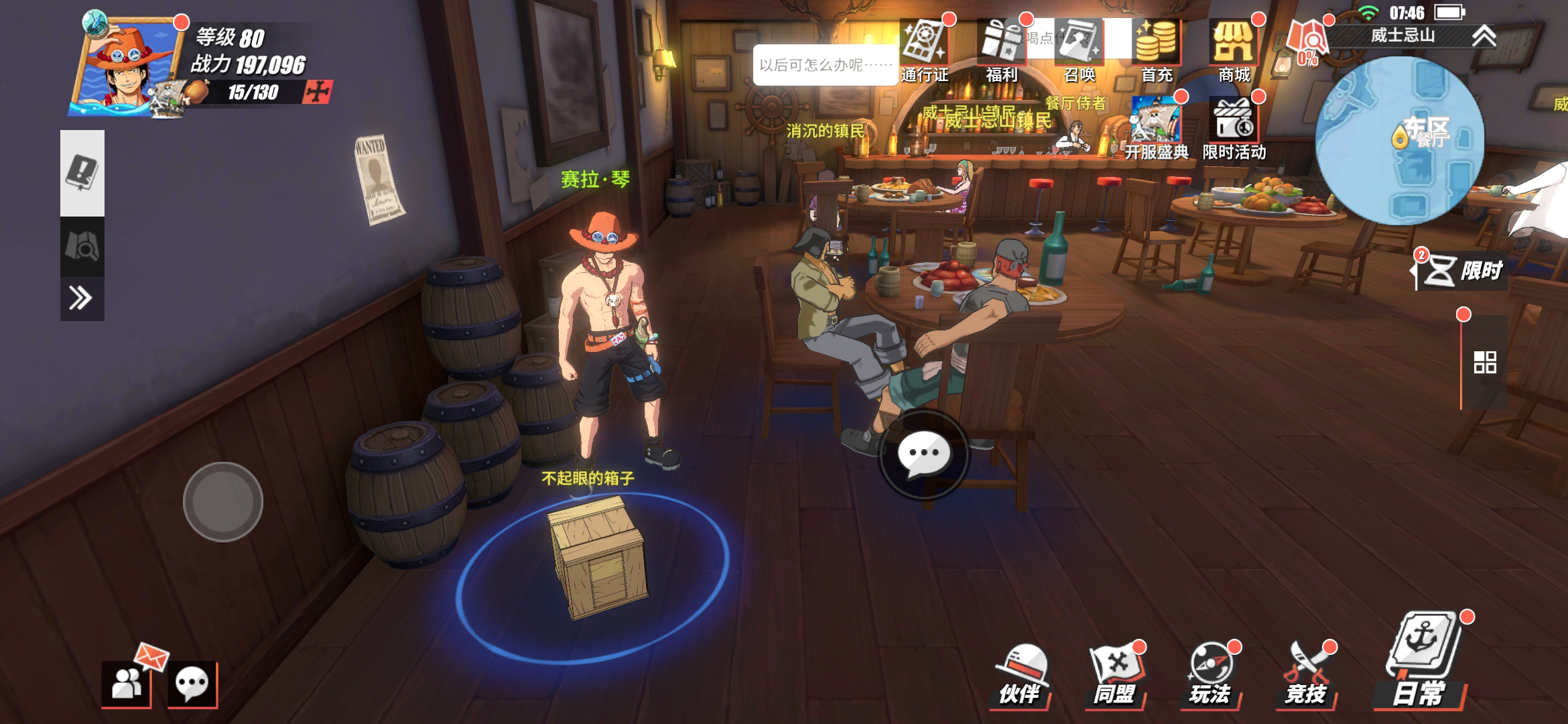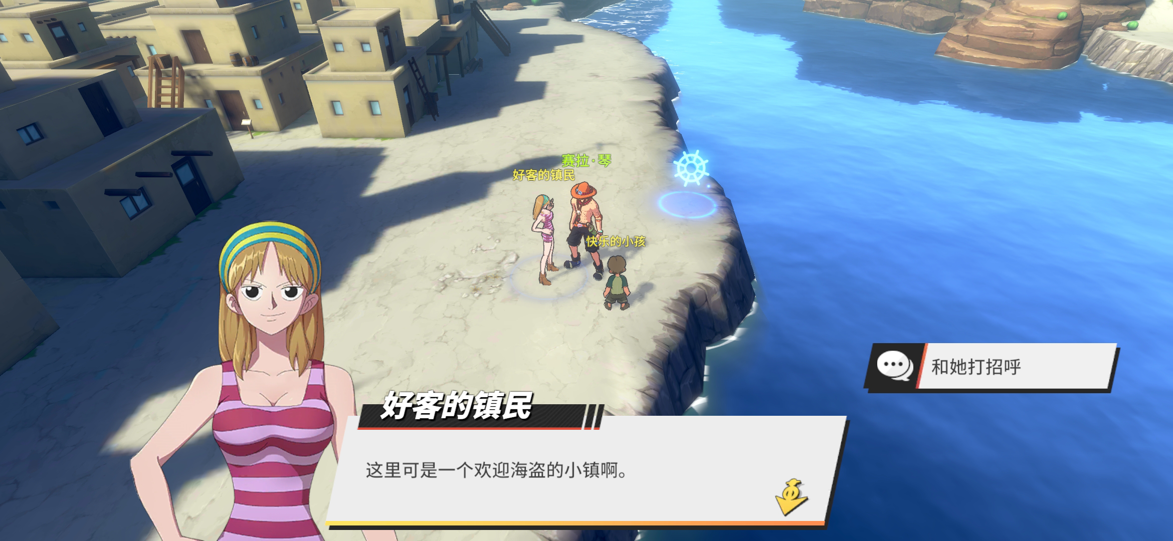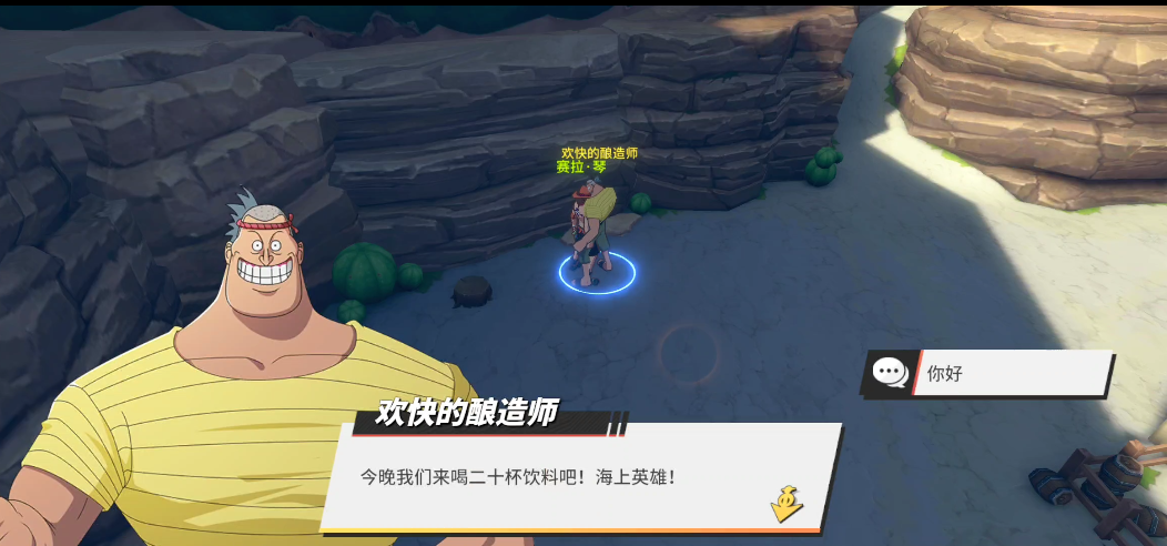 威士忌山——NPC对话威士忌山被分为东西两大区域,东区是餐厅、仙人掌岩,西区是宴会地点和秘密联络点。玩家从西区码头上岸后,会与当地居民进行一段对话,大意是欢迎海贼们的到来。结束对话后,码头口有一个NPC“好客的镇民”,玩家与她对话就可以开启隐藏对话,在对话结束之后就可以获得1万贝里。