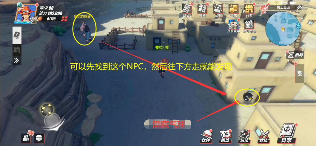 隐藏气球的位置位于西区地图的左下角,找不到的玩家可以寻找西区左侧的NPC“阴沉的镇民”,在他斜下方就可以看见隐藏气球。
