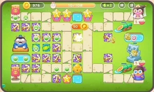 2.前面的障碍物清掉后把空位全部用船锚占满,方便打飞线怪(别急着用戏法兔买炮,先把空位占满了再买200金币的炮,增加开出星星的几率)