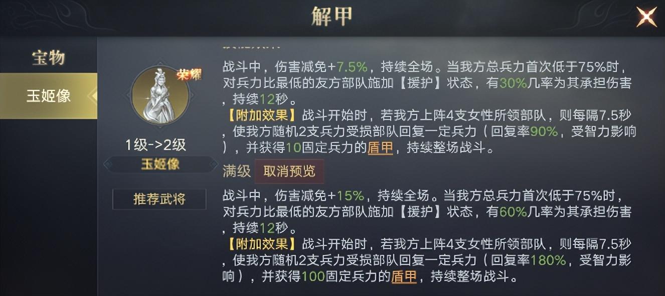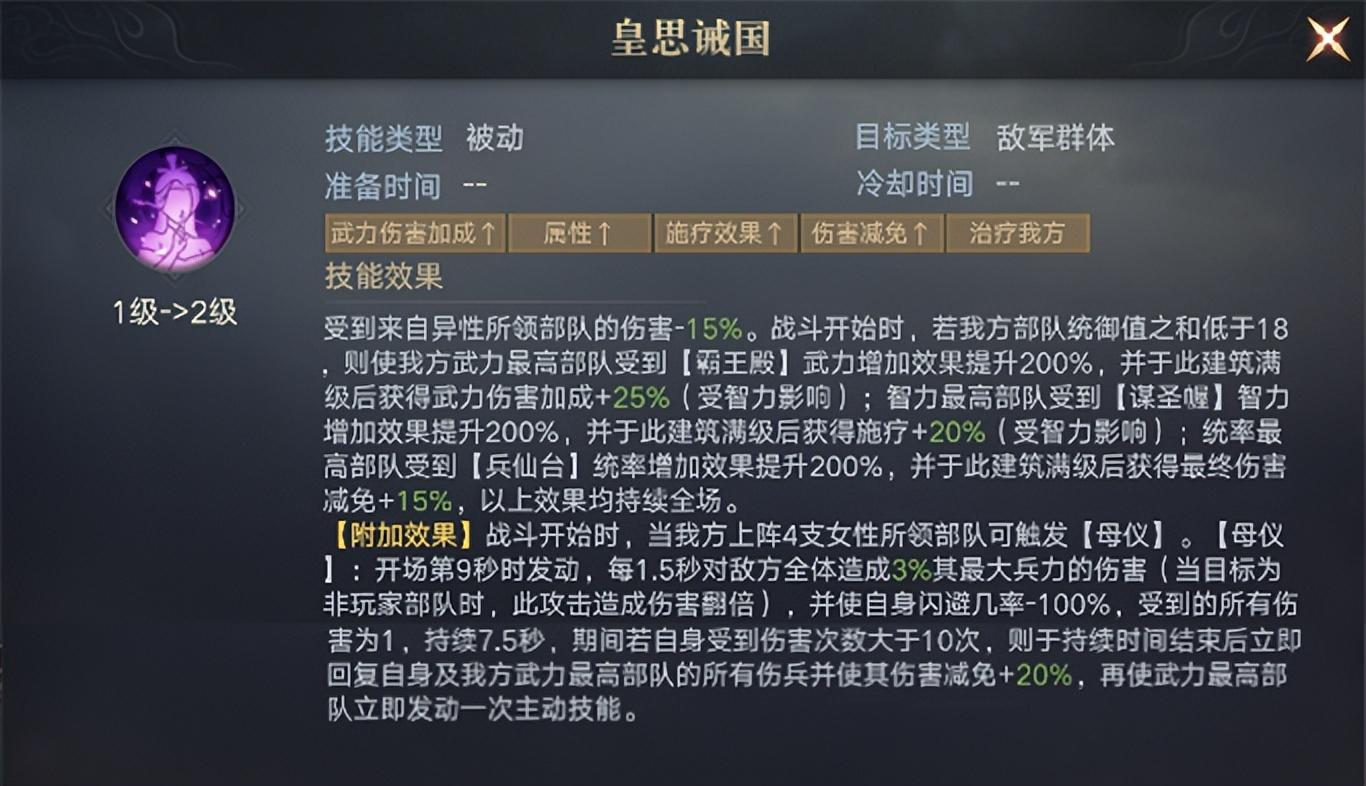 不难看出,蜀·昭烈皇后与此前的武将技能设计方向完全不同,由三殿等级决定技能效果的强度,意味着该队伍可以在开荒期发挥出巨大的作用。
