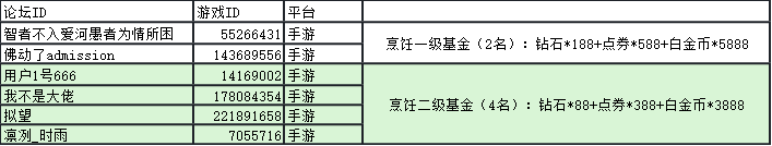 烹饪一级基金(3名):钻石*188+点券*588+白金币*5888