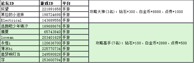 攻略高手(7名):钻石*100、白金币*2888、点券*500