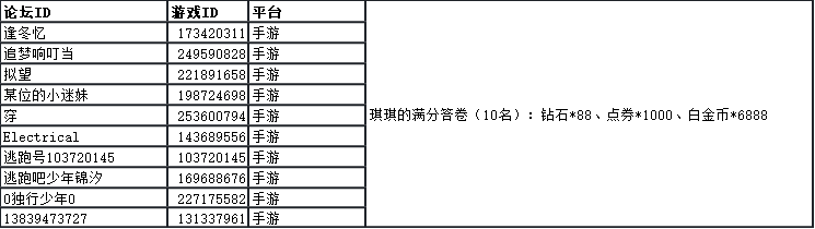 琪琪的满分答卷(10名):钻石*88、点券*1000、白金币*6888