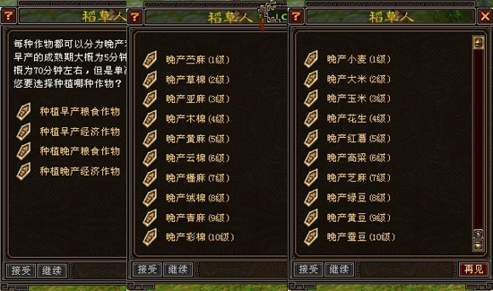 小麦、种植技能1级。、大米,种植技能2级。、 玉米,种植技能3