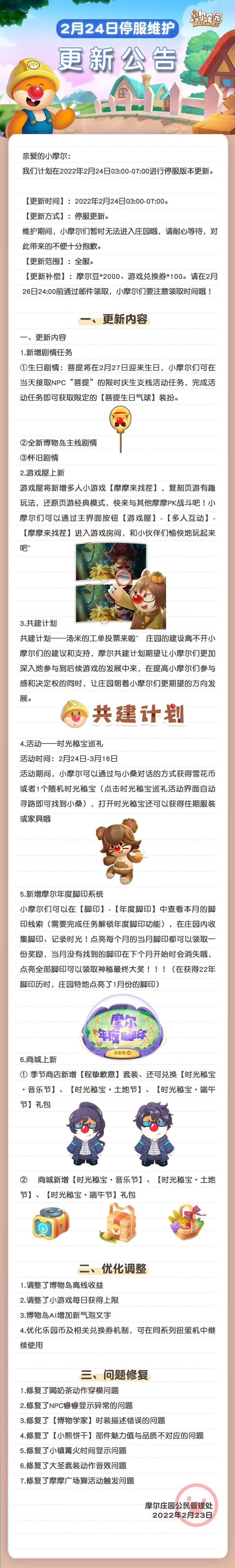 在本次的更新中,我们将会开启共建计划、摩尔年度脚印、时光秘宝巡礼等活动,还会上线新的小游戏《摩摩来找茬》和开展新的博物岛和怀旧剧情任务等新内容!