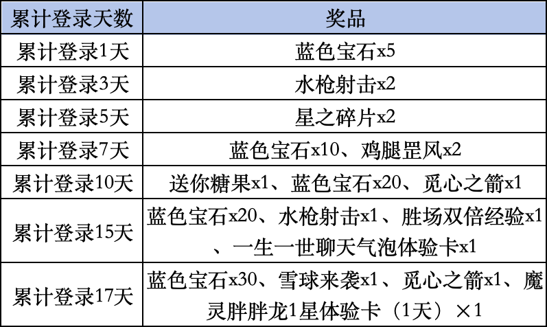 3、累计登录领好礼:活动期间,用户累计登录游戏达到指定天数即可领取对应奖励,奖励将会通过游戏内邮件进行发放(领取有效期15天);单用户仅限领取一次,具体奖励如下: