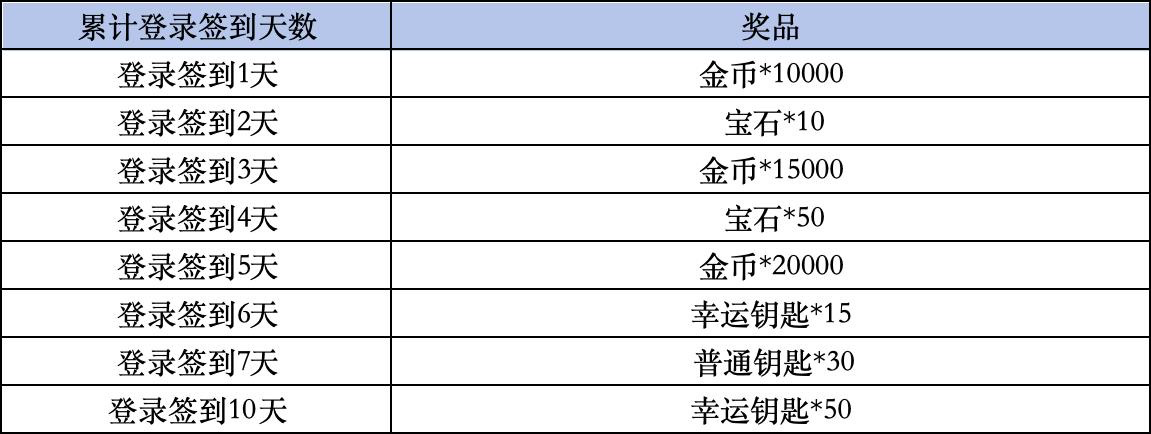 6、累登领好礼:活动期间,用户每日登录游戏后在本页面完成签到即可领取对应奖励(1签到积分=签到1天),道具奖励将会通过游戏内邮件进行发放(领取有效期7天);单用户仅限领取一次,具体奖励如下: