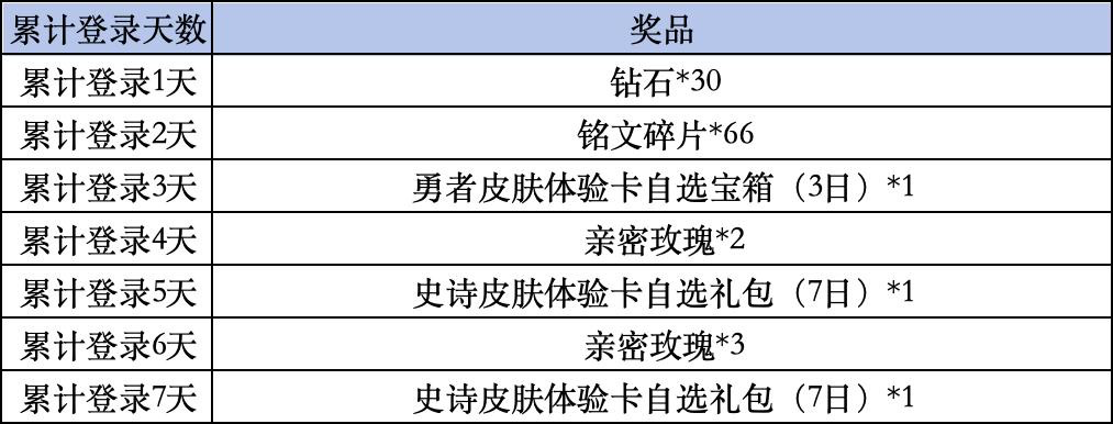 3、回归福利:活动期间,回归用户(近30日未登录游戏的用户)登录游戏当日即可在本页面领取【钻石*20、史诗皮肤体验卡自选礼包(7日)*1、亲密玫瑰*2】,道具奖励将会通过游戏内邮件进行发放(领取有效期7天);单用户仅限领取一次。