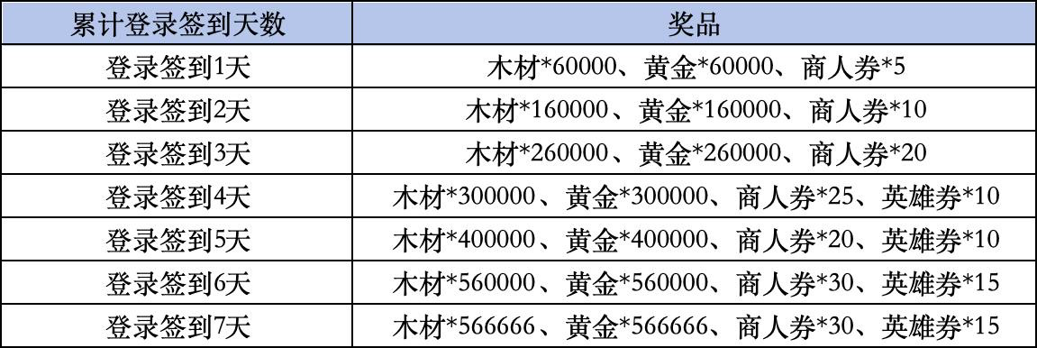 3、回归领好礼:活动期间,2025年10月26日起未登录游戏的老用户登录游戏当日可在本页面领取【木材*1200000、黄金*1200000、石材*1200000】,道具奖励将会通过游戏内邮件进行发放(领取有效期7天);单用户仅限领取一次。