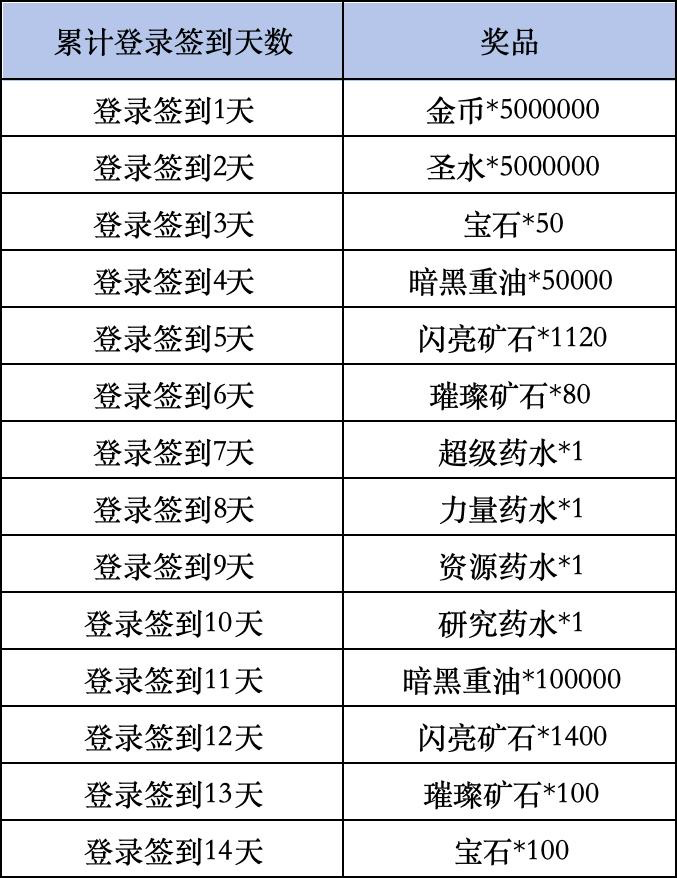 4、登录签到领好礼:活动期间,用户每日登录游戏后在本页面完成签到即可领取签到积分*1,每获得1签到积分=签到1天,累计签到达到指定天数即可领取对应奖励,领取的道具奖励将会通过游戏内邮件进行发放(领取有效期7天);单用户仅限领取1次,奖励详情如下:
