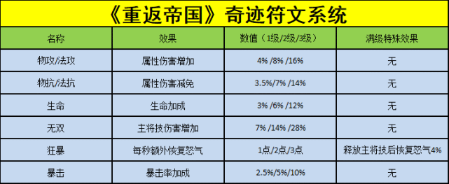 接下来介绍符文系统。基础设定有两个,每个队伍可携带三个不同符文;部分符文如生命、狂暴等每两个低级的可自动合成为一个更高级的。我整理了目前已上线符文的基本信息,汇总如下: