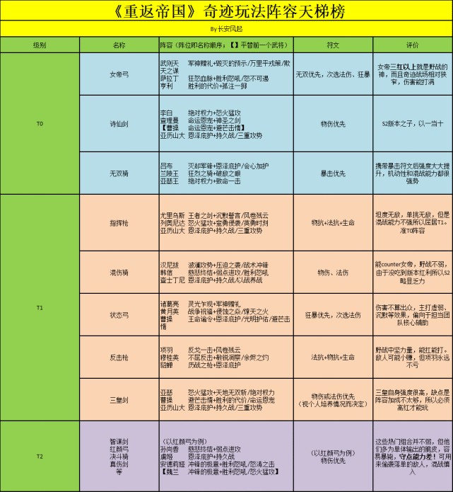 结合上面提到的占点机制、不死兵复活机制和符文系统,我整理了一套奇迹玩法阵容天梯榜,供大家参考。排名的主要依据是混战输出能力和坦度,如有疏漏之处欢迎大佬指正。