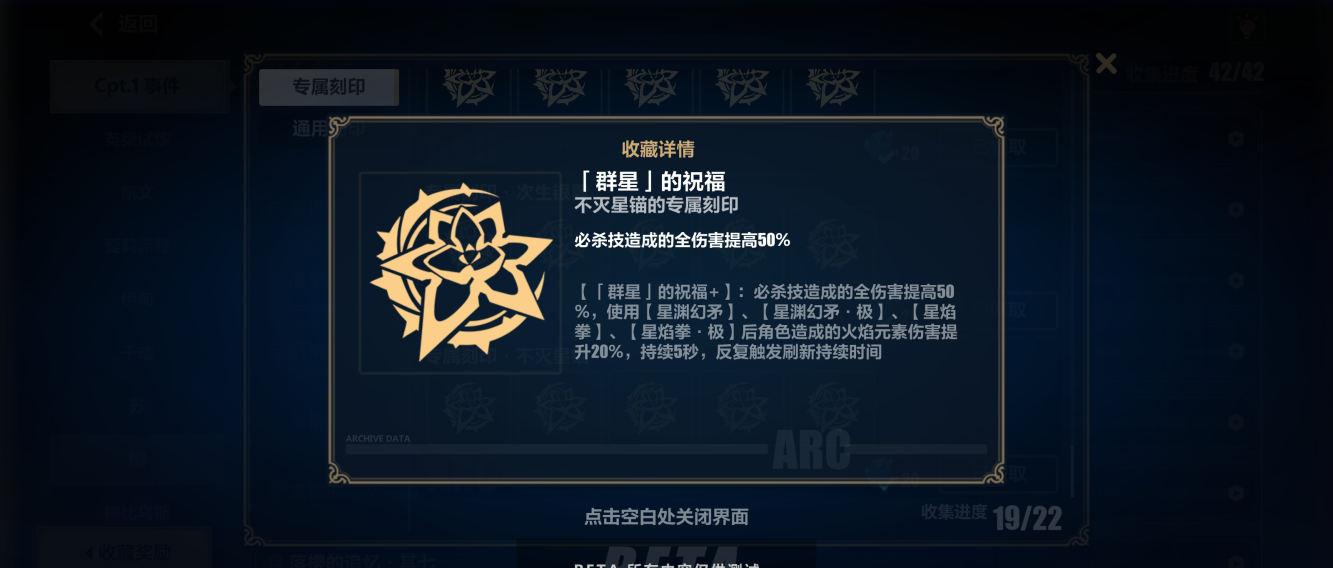 专属刻印「群星」开局,无条件加全伤,可以单专属用到结束;运气好看到其它专属就拿「长烁」›「日冕」,可以改善流程,提高星铠的持久性,来回变身挺费时间容易超时;最次拿「烈风」;不拿和新「黄金」冲突的「升耀」。