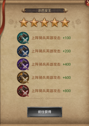 示巴女王(24级手动解锁):好感度提升上阵骑兵基础攻击百分比,提升木材产量;升星提升上阵骑兵攻击