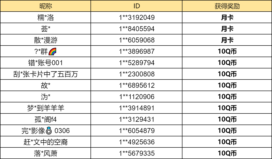 为了保护大家的个人隐私,以后开奖信息将由部分屏蔽的昵称+ID组成,小伙伴们可一定要仔细核对哦~