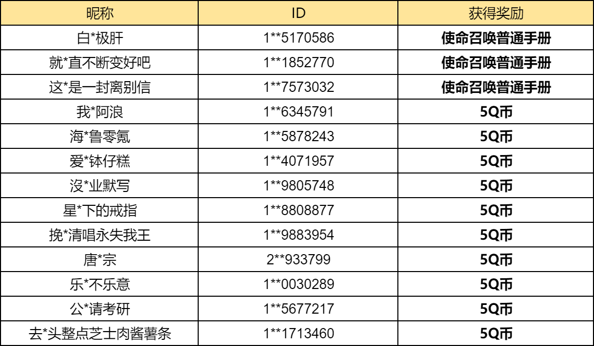为了保护大家的个人隐私,以后开奖信息将由部分屏蔽的昵称+ID组成,小伙伴们可一定要仔细核对哦~