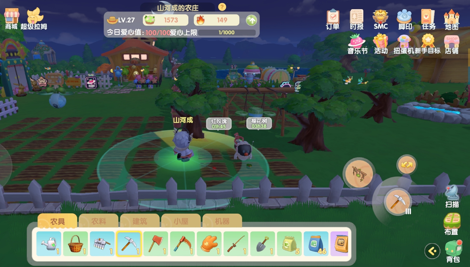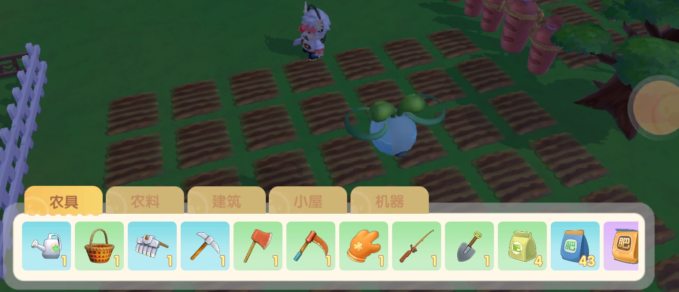 浇水,采摘,锄地,挖矿,砍树,割草,播种,钓鱼,填平,初级肥料,中级肥料和高级肥料。
