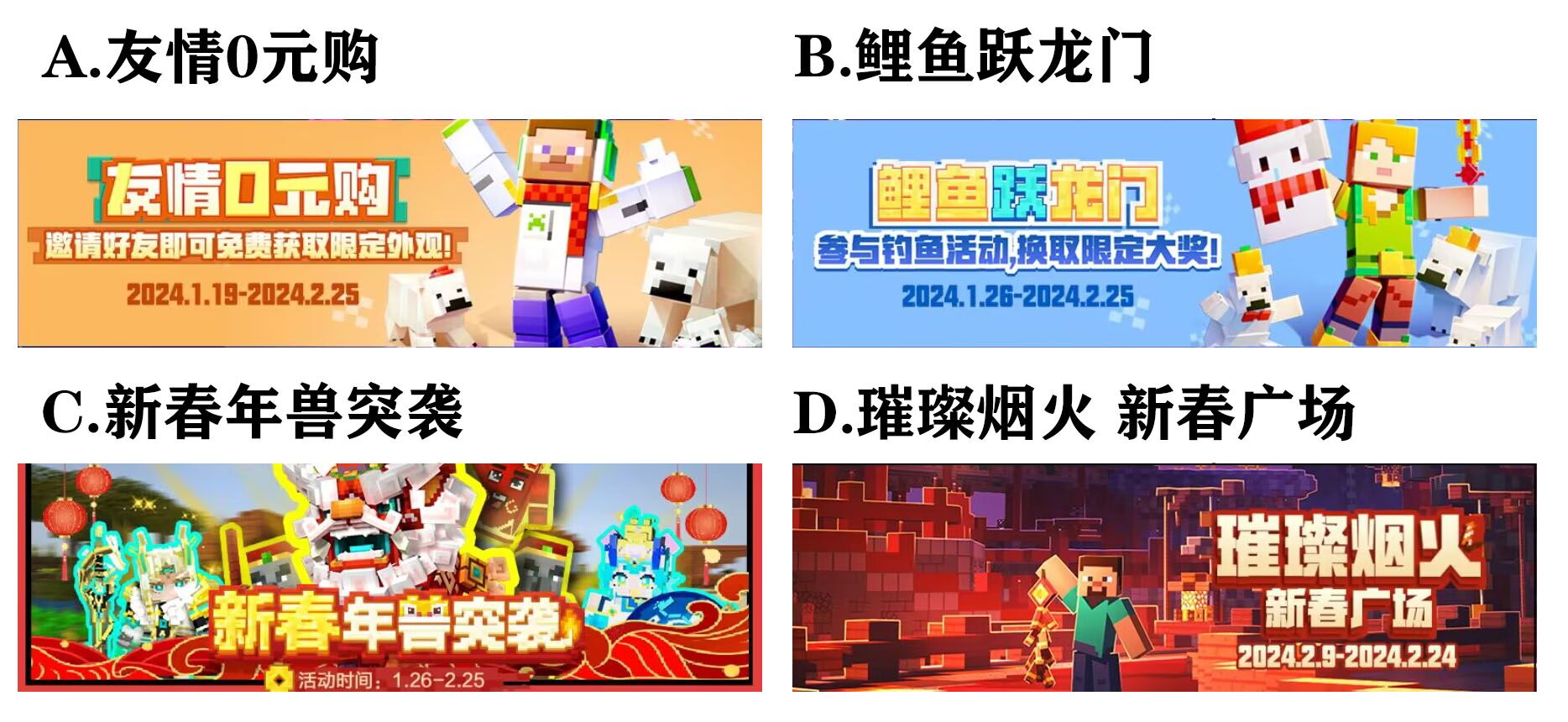 Hello,MC的各位小伙伴,龙年新春版本现已上线!在我的世界里拜大年!限定外观零元购,钓鱼兑大奖,驱年兽,贺新春,各种最具有特色玩法等你体验!最后是新春广场,不知道会不会聚齐大家吃饺子送大礼呢?真是期待啊!那么你最喜欢哪个活动呢?欢迎各位投票选择评论一下吧!投票还有机会赢取奖励哟!